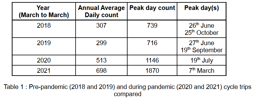 The most reliable measure of this can be obtained by comparing whole year averages before and during the pandemic. Given the restrictions started in March 2020 and there is counter data to March 2022, it makes sense to consider year periods starting in March 2018 going through to March 2022. For each of these annual periods, the average daily count has been calculated and is given in Table 1 below.